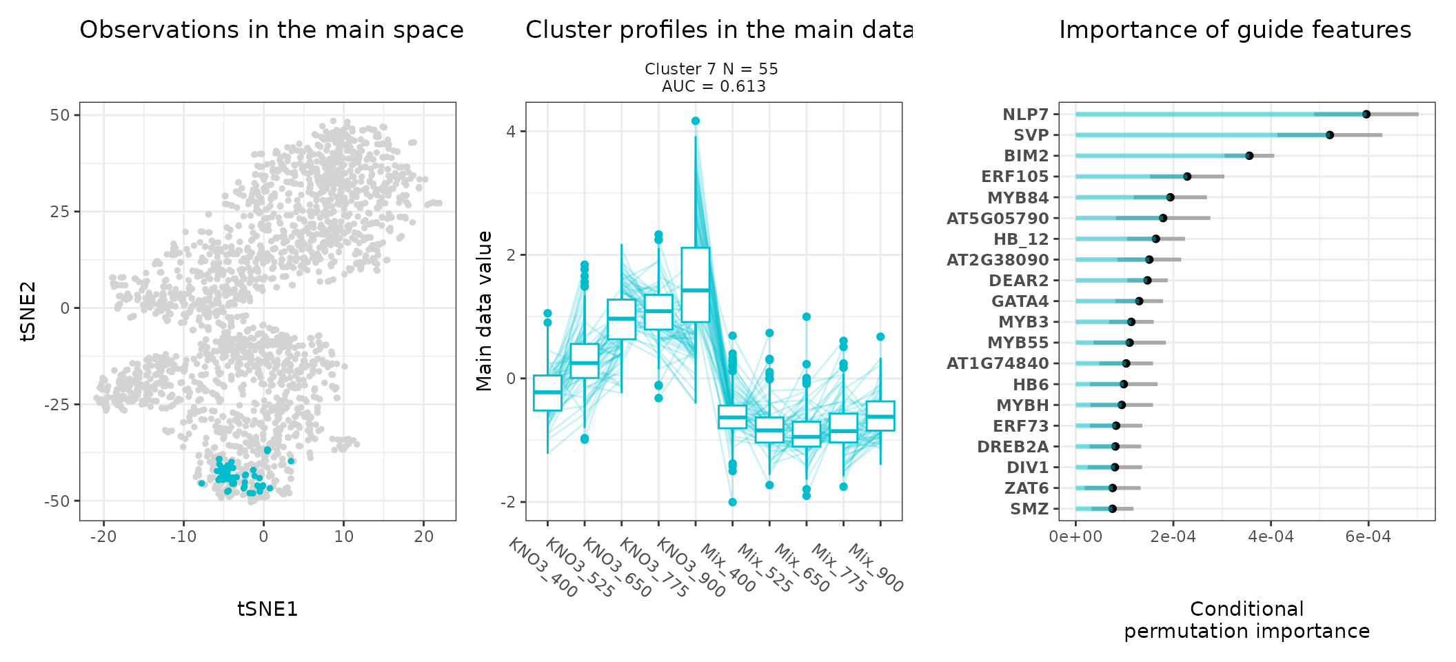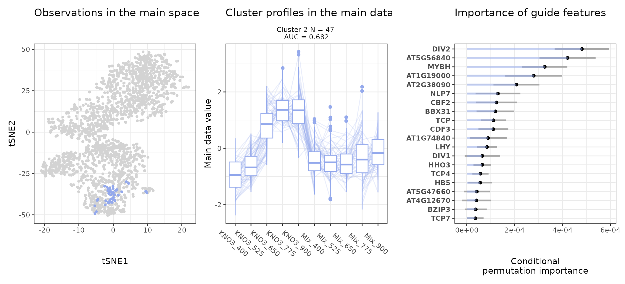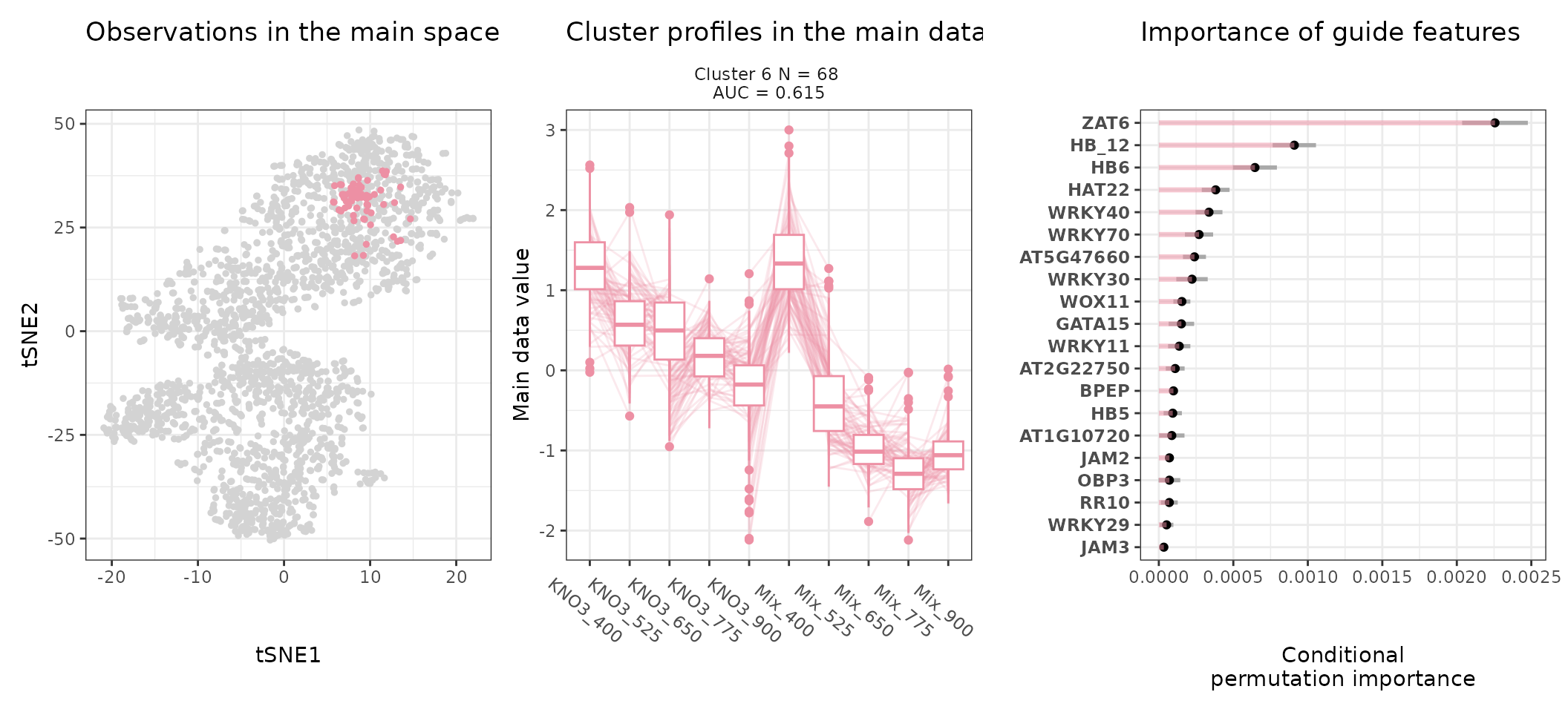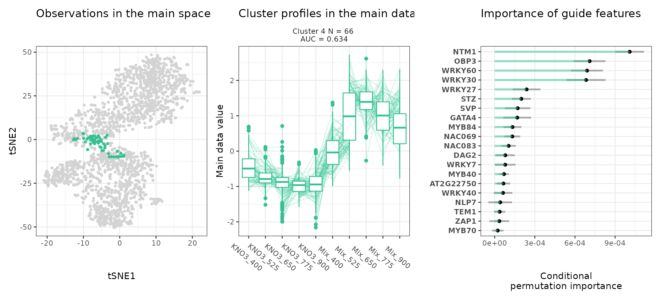 A few visualization solutions are included in the package, and are assembled together below. This gives an overview of the clustering, by showing the observations in the main space (the expression space, reduced in a tSNE), and colored by cluster. Next to it, the expression profiles of the genes appear for each cluster, ranked by AUC. Stoic here identified a series of diverse expression profiles in response to CO2 elevation (like activation, repression), that can vary depending on the type of nitrate nutrition provided. The fact that nitrate nutrition is tightly linked to the response to elevated CO2 has already been documented in the literature, and is very promising to uncover the pathways involved in CO2 acclimation and mineral nutrition alteration in plants.