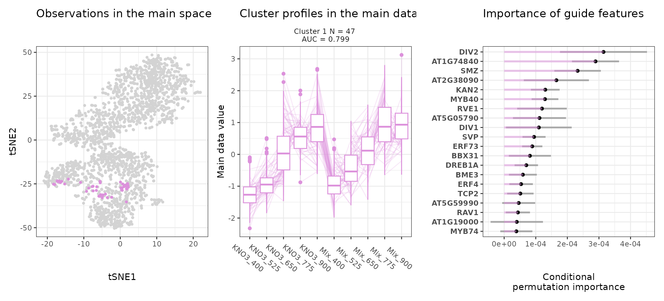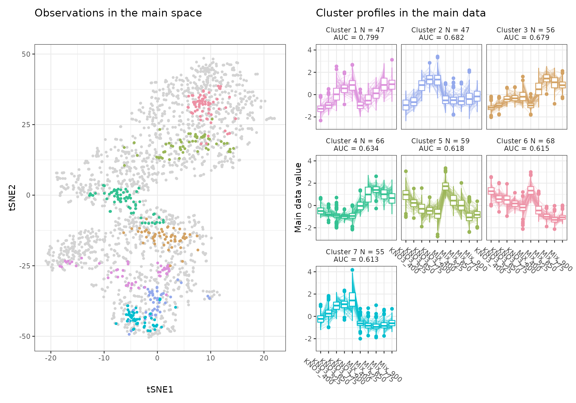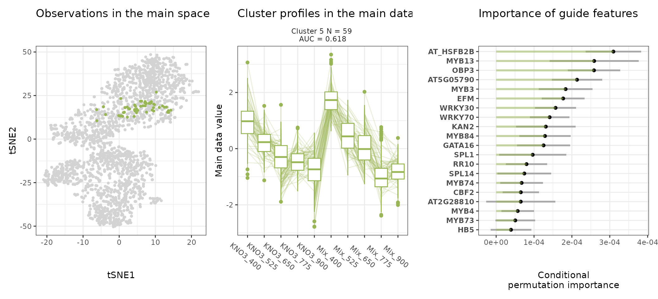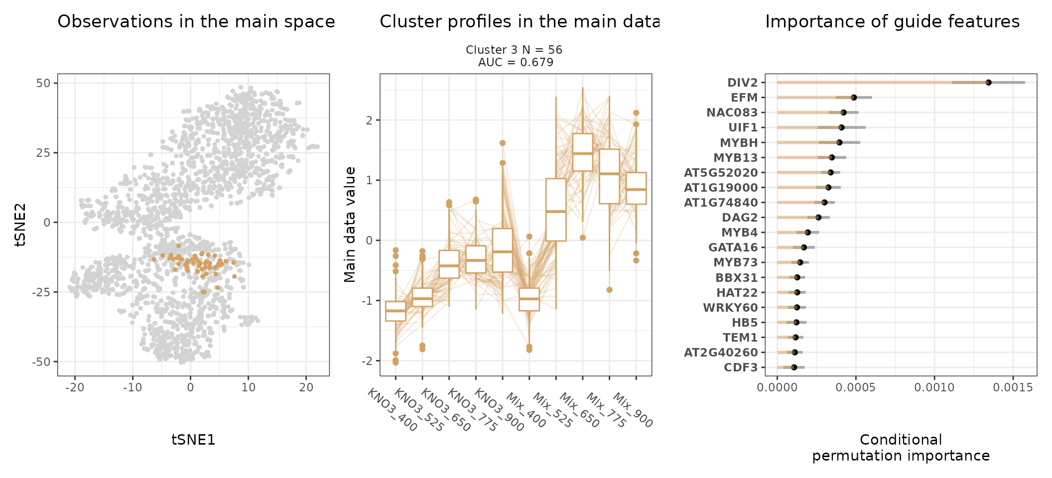 A few visualization solutions are included in the package, and are assembled together below. This gives an overview of the clustering, by showing the observations in the main space (the expression space, reduced in a tSNE), and colored by cluster. Next to it, the expression profiles of the genes appear for each cluster, ranked by AUC. Stoic here identified a series of diverse expression profiles in response to CO2 elevation (like activation, repression), that can vary depending on the type of nitrate nutrition provided. The fact that nitrate nutrition is tightly linked to the response to elevated CO2 has already been documented in the literature, and is very promising to uncover the pathways involved in CO2 acclimation and mineral nutrition alteration in plants.