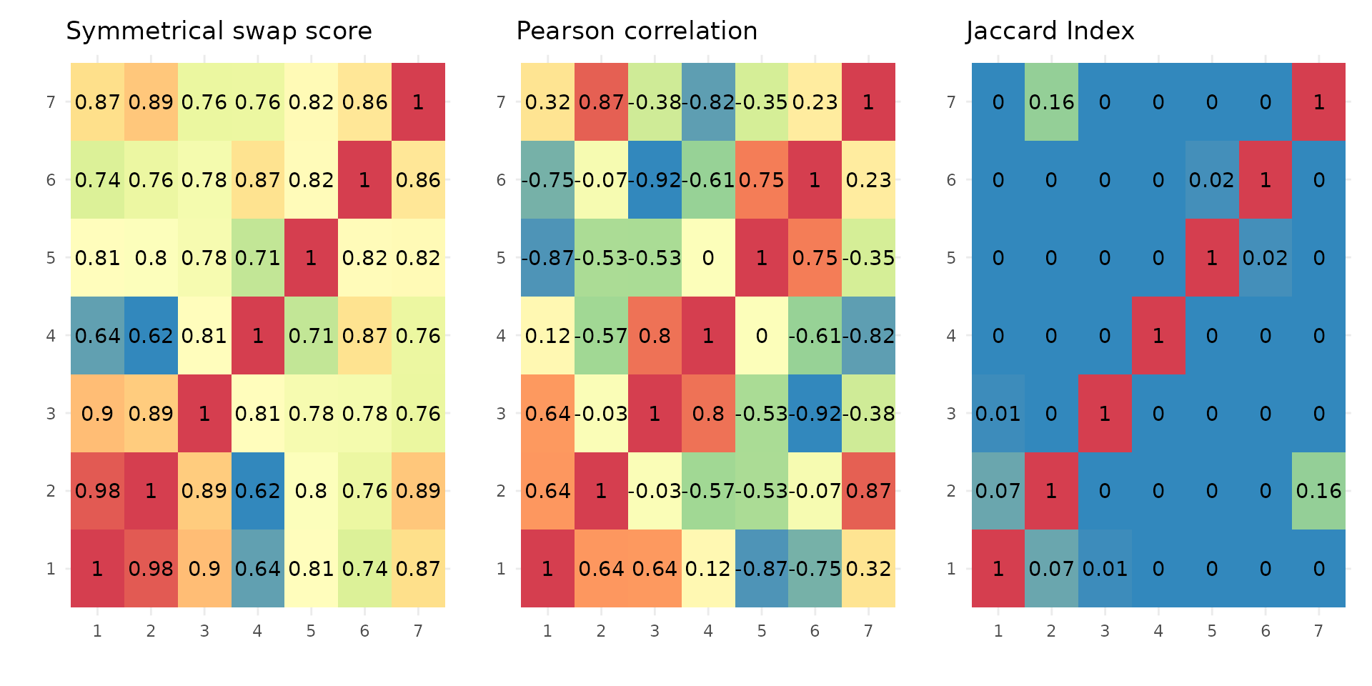 It can also be helpful to see how similar are the inferred clusters to one another. This is done internally by stoic to prune redundant clusters, but can also be visualized downstream of the clustering. Three similarity measures are used: